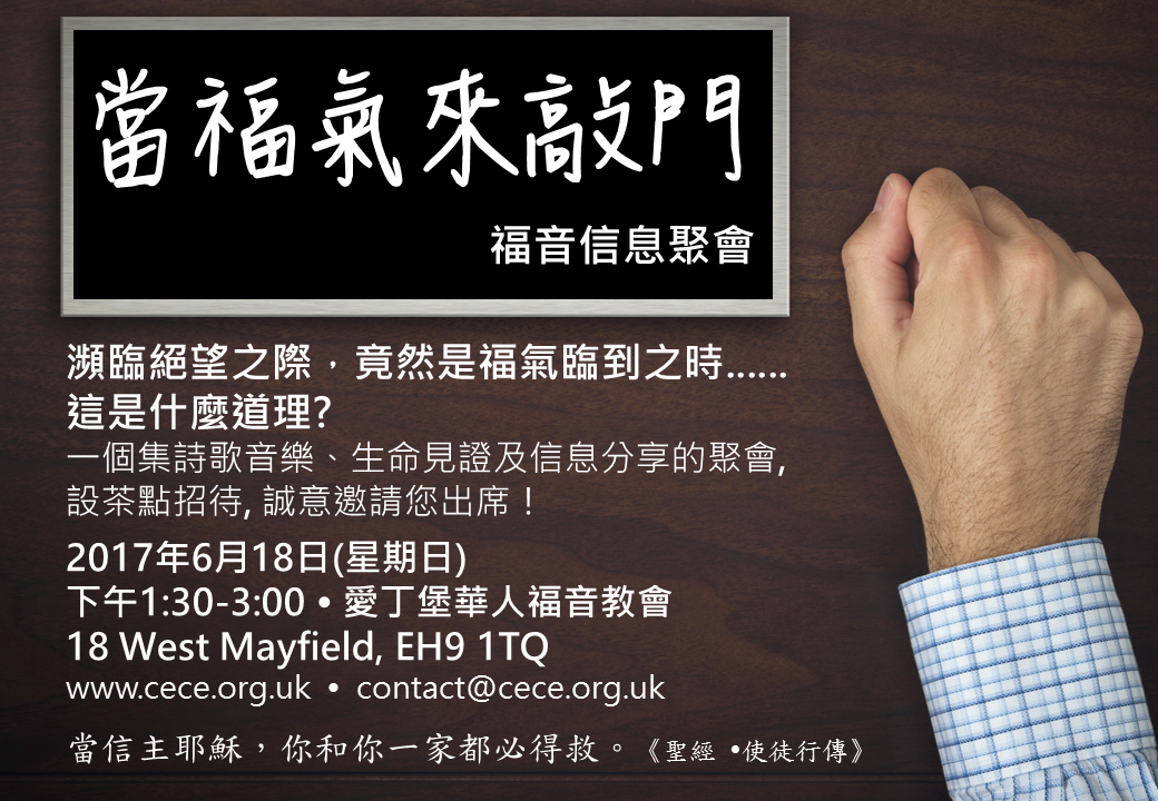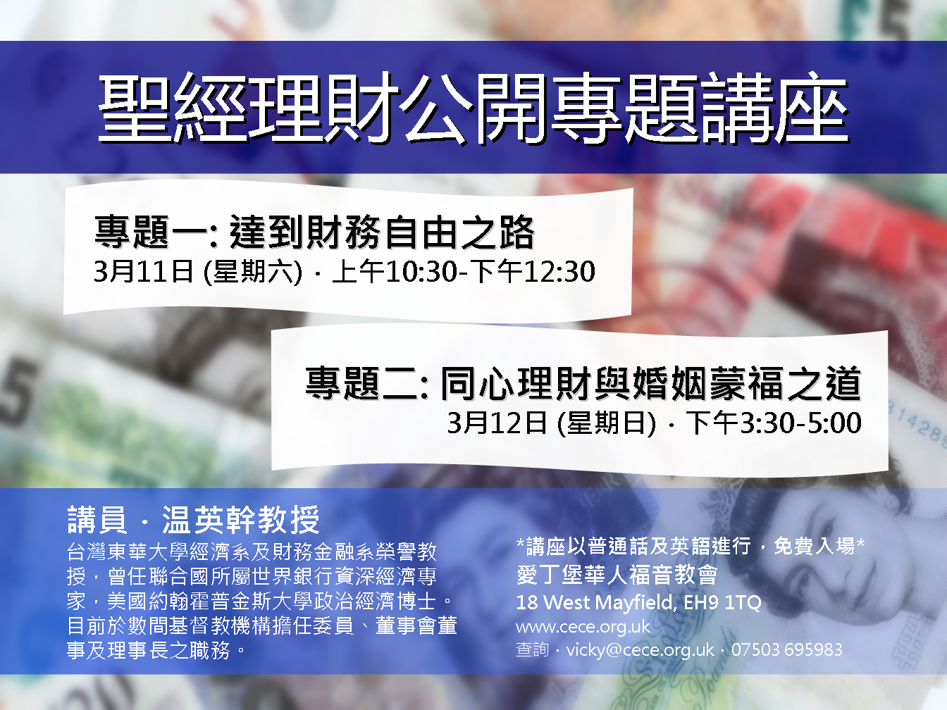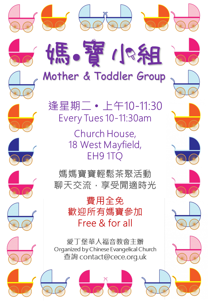 「回家」開學迎新晚會 聖經深讀課程—民數記研讀:誰偷走了40年(中)。 "當福氣來敲門"福音信息聚會: 瀕臨絕望之際,竟然是福氣臨到之時......這是什麼道理?一個集詩歌音樂、生命見證及信息分享的聚會,設茶點招待。請弟兄姊妹積極邀約朋友和家人出席,並為聚會禱告,願更多人得聞福音,得着永恆的福氣。(04/06/17) 逢星期二上午10-11:30在Church House開設媽寶小組。讓親子輕鬆茶聚活動、聊天交流、享受閒適時光。費用全免,公開歡迎所有媽寶參加。(04/06/17) 聖經深讀課程—民數記研讀:誰偷走了40年(上)。以色列人在曠野漂流40年這一段歷史,深信對以色列人來說不可磨滅,究竟誰奪去他們這40年?。此課程能讓每一個信徒經歷信仰掙扎之旅,又能體會在曠野的成長之路!。日期:4月2日-6月18日 (八堂,4月9及30日,5月14及28日暫停)。時間:主日下午3:30-5:30。(26/02/17) 家庭退修日:在家庭中遇見神。活動包括讀經,敬拜,小組討論及暢游North Berwick小城,並有專業為兒童而設的活動。日期:4月8日。時間:10:00am。地點:St Baldred's Church,2 Dirleton Ave,North Berwick EH39 4AY。費用:每位£5,家庭£10,包括午餐,往回交通請自行安排。(26/02/17) 聖經專題講座:合神心意的智慧理財。講員:溫英幹教授 (美國約翰霍普金斯大學政治經濟博士,現任台灣東華大學經濟系及財務金融系榮譽教授,同時也擔任多間福音機構董事,並從事基督信仰與財經方面議題之寫作與講座。) (26/02/17) |